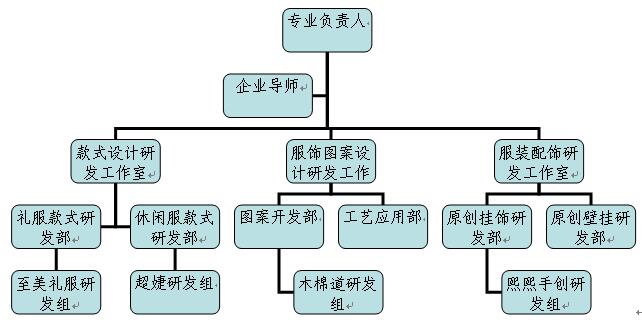 1、現(xiàn)我院共有服裝、服飾工作室3個(gè),每個(gè)工作室有2個(gè)研發(fā)部,4個(gè)企業(yè)冠名研發(fā)組,每個(gè)研發(fā)部由15名學(xué)生、2名專業(yè)教師、1名企業(yè)技術(shù)指導(dǎo)構(gòu)成。服裝專業(yè)2名負(fù)責(zé)人3名企業(yè)導(dǎo)師負(fù)責(zé)整個(gè)團(tuán)隊(duì)運(yùn)轉(zhuǎn),如圖1所示。