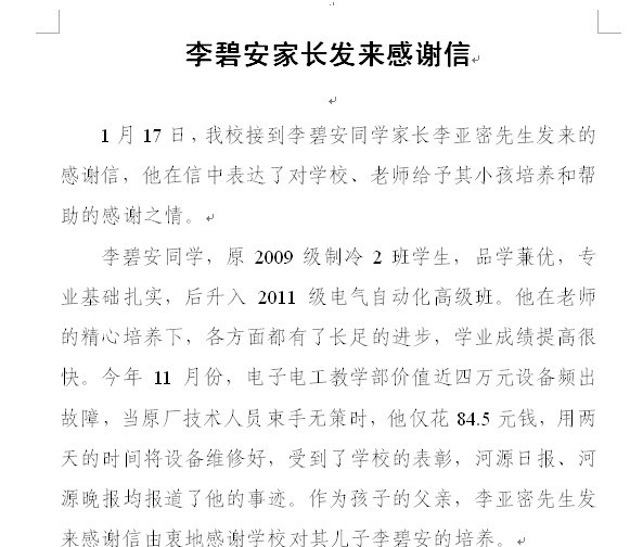 李碧安家長發(fā)來感謝信 1月17日,我校接到李碧安同學(xué)家長李亞密先生發(fā)來的感謝信,他在信中表達了對學(xué)校、老師給予其...