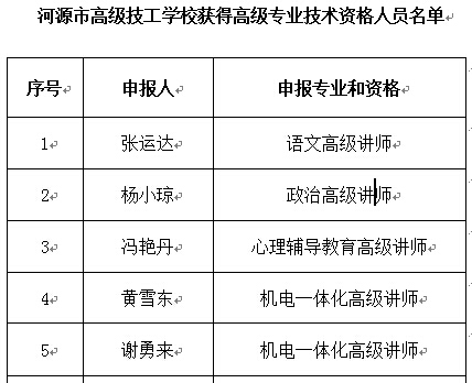 經(jīng)廣東省技工學校教師專業(yè)技術(shù)資格評審委員會評審,下列同志獲得高級專業(yè)技術(shù)資格,現(xiàn)予公示。公示時間從2014年12月8日上午8:00至2014年12月14日下午5:30止。若對下列同志取得資格有異議,請電話或書面向廣東省技工學校教師專業(yè)資格評審辦公室或河源市高級技工學校辦公室反映。反映情況的電話和書面材料要自報或簽署真實姓名,不報或不簽署真實姓名的,一律不予受理。