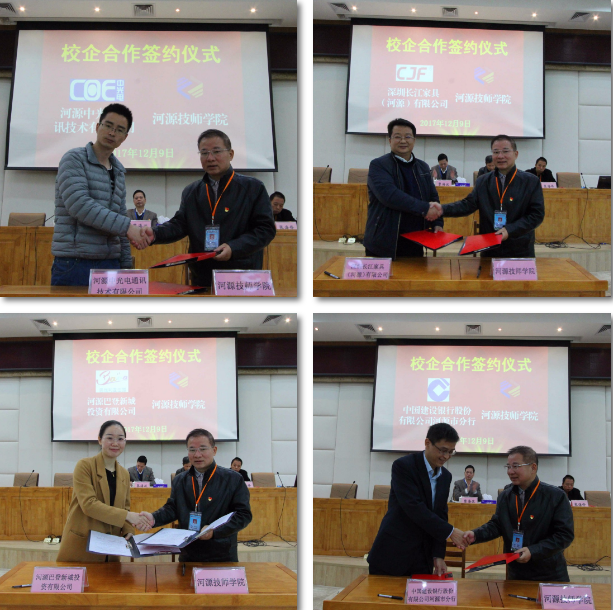 會(huì)上,梁秋生副院長宣讀了《河源技師學(xué)院關(guān)于調(diào)整專業(yè)建設(shè)指導(dǎo)委員會(huì)委員的決定》,并代表學(xué)院與河源中光電通訊技術(shù)有限公司、深圳長江家具(河源)有限公司、河源巴登新城投資有限公司、中國建設(shè)銀行股份有限公司河源市分行、河源巴伐利亞莊園福朋喜來登度假酒店、佛山市順德海爾電器有限公司、雅閣酒店管理(北京)有限公司、深圳市新飛龍柴油機(jī)有限公司、木林森股份有限公司、東莞南陽橡膠制品有限公司、河源市志良網(wǎng)絡(luò)科技有限公司、河源市新銳網(wǎng)絡(luò)科技有限公司12家合作企業(yè)簽約。