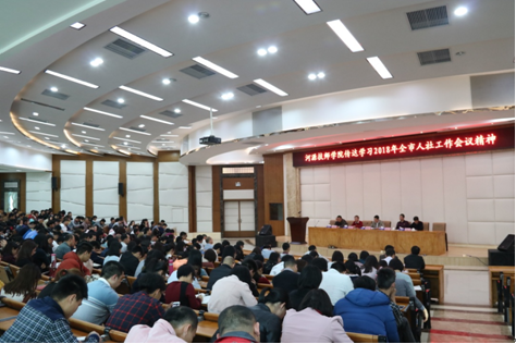 2018年4月8日下午,我院全體教職工在圖書館報告廳召開專題會議,傳達學(xué)習(xí)2018年全市人社工作會議精神。黎海波院長主持會議。