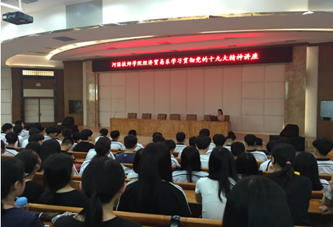 2018年4月23日下午,我院經(jīng)濟(jì)貿(mào)易系在圖書館報(bào)告廳舉辦了“學(xué)習(xí)貫徹黨的十九大精神”專題講座。講座由經(jīng)濟(jì)貿(mào)易系賴珊珊老師擔(dān)任主講,經(jīng)濟(jì)貿(mào)易系黨支部全體黨員、經(jīng)貿(mào)系團(tuán)總支書記及全體同學(xué)參加了學(xué)習(xí)。