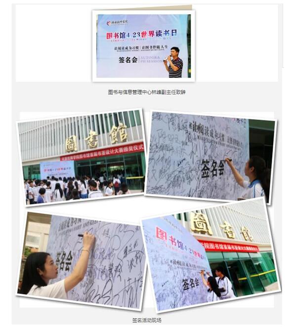 同學(xué)們用筆在背景墻上簽名,參與到“全校閱讀·我行動”的行列當中來。圖書與信息管理中心林峰副主任指出,借世界讀書日到來之際,圖書館開展系列讀書活動,歡迎同學(xué)們積極參與,希望同學(xué)們當閱讀使者,讓閱讀成為習(xí)慣。