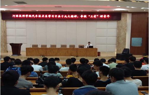 為深入貫徹落實黨的十九大精神,更好地加強青年學(xué)生思想教育和指導(dǎo),2018年4月26日,汽車技術(shù)系在圖書館講學(xué)廳召開了“學(xué)習(xí)十九精神,做‘三有’好青年”的主題講座。講座由汽車技術(shù)系黨支部書記石功名主講,系部全體師生參加。