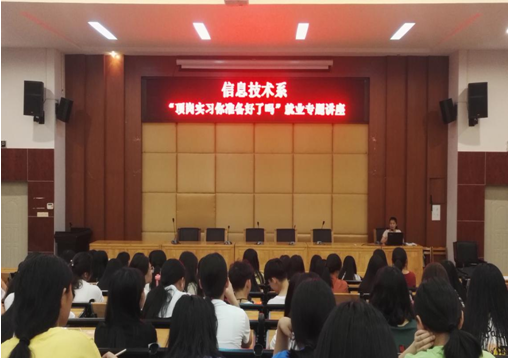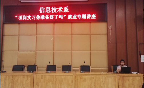 為了引導(dǎo)即將頂崗實(shí)習(xí)的學(xué)生做好工作的心理準(zhǔn)備。5月15日晚,信息技術(shù)系在培訓(xùn)樓講學(xué)廳舉辦了“頂崗實(shí)習(xí)你準(zhǔn)備好了嗎”就業(yè)專題講座。講座邀請(qǐng)了我院信息技術(shù)系2015屆商務(wù)文秘專業(yè)優(yōu)秀畢業(yè)生梁小芳為主講嘉賓,文秘專業(yè)教研組長巫艷芬老師出席,文秘專業(yè)全體學(xué)生聆聽了講座。
