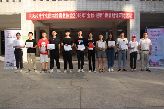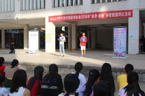 為豐富社團(tuán)文化生活,提高同學(xué)們的朗讀能力,2019年9月19日,圖書館讀書協(xié)會(huì)在培訓(xùn)樓廣場(chǎng)舉辦了“金秋·迎新”詩(shī)歌朗誦評(píng)比活動(dòng)。