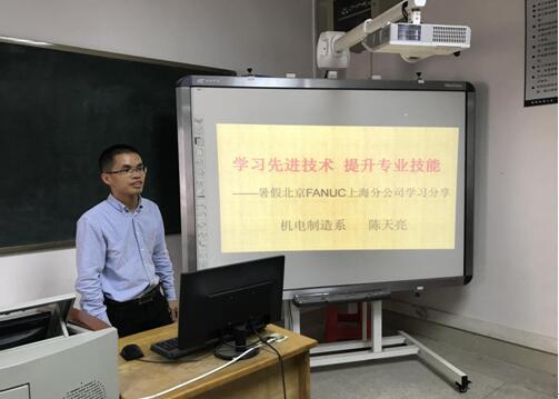 2018年10月22日下午,機電制造系陳天亮老師在6號樓101一體化室舉辦暑假北京FANUC上海分公司學習分享會。機電制造系龍衛(wèi)軍主任、劉會平副主任、黃志平副主任,以及系部全體老師參加了此次分享會。