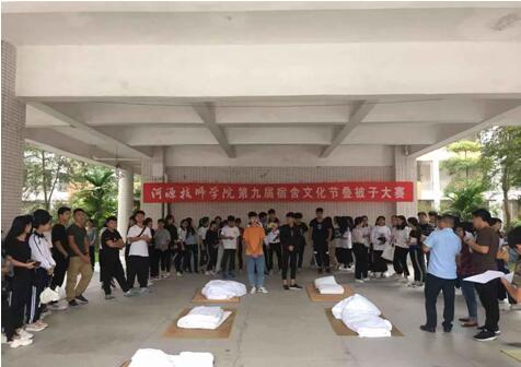 2018年11月12日下午,學(xué)院第九屆宿舍文化節(jié)之疊被子大賽在培訓(xùn)樓廣場(chǎng)順利開展。比賽邀請(qǐng)生活老師擔(dān)任評(píng)委,全院各寢室代表參加了此次比賽。
