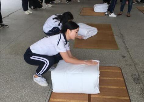 比賽分批進(jìn)行,每組比賽時(shí)間為1分鐘。比賽開始前,各參賽寢室代表按照要求在規(guī)定區(qū)域準(zhǔn)備,并將凌亂的棉被放在涼席上。主持人一聲令下,比賽正式開始。同學(xué)們認(rèn)真整理被子,不放過任何一點(diǎn)皺褶的地方,男同學(xué)也絲毫不比女同學(xué)差,將被子疊得方方正正,像“豆腐塊”形狀。