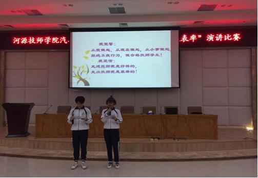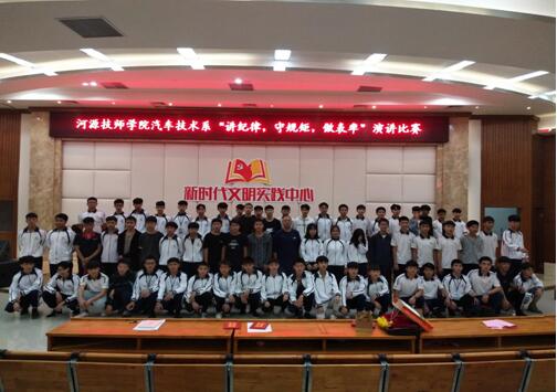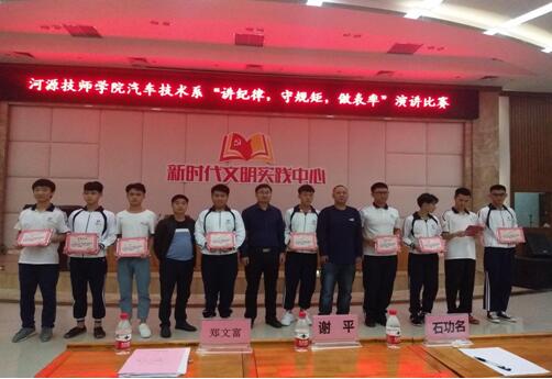 為嚴(yán)格規(guī)范學(xué)生日常行為,提高思想認(rèn)識,更好地成長為德才兼?zhèn)涞募寄苋瞬牛?span>2018年12月5日,汽車技術(shù)系在圖書館報告廳舉辦了“講紀(jì)律、守規(guī)矩、做表率”演講比賽。汽車技術(shù)系黨支部書記、主任石功名,副主任謝平,系團(tuán)總支書記鄭文富出席,專業(yè)教師李發(fā)船、艾文軍、梁海深和張宇飛擔(dān)任比賽評委。