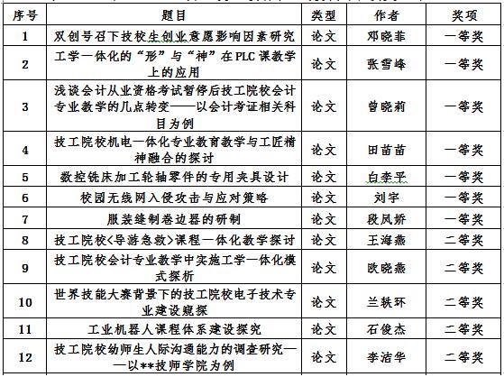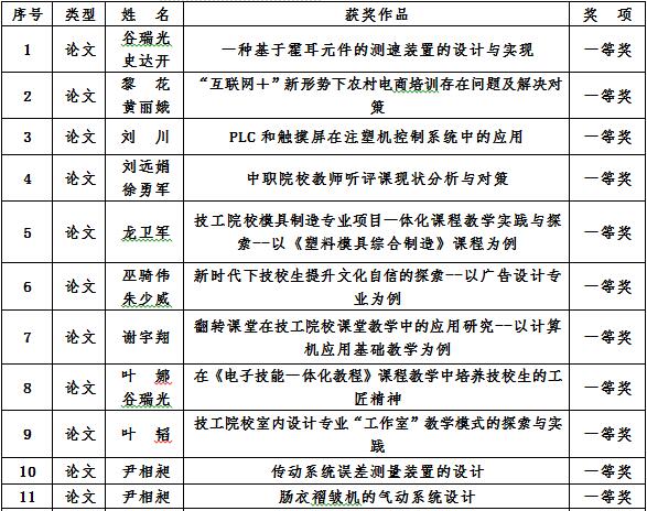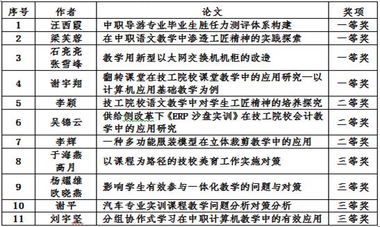 2018年《廣東技工教育研究》優(yōu)秀論文評選,共送評論文21篇,其中11篇獲獎,一等獎4篇,二等獎3篇,三等獎4篇。(表4)
