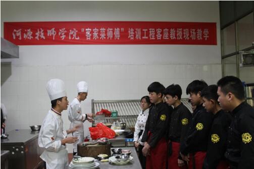 結(jié)合《粵菜師傅風(fēng)味系列—客家風(fēng)味菜烹調(diào)工藝》培訓(xùn)教材開(kāi)發(fā)需要, 2019年3月2日-3日,在學(xué)院院長(zhǎng)張海鋒、副院長(zhǎng)梁秋生的組織下,河源技師學(xué)院烹飪專(zhuān)業(yè)客座教授楊明輝、黃文鋒、劉順煌三位企業(yè)大廚為學(xué)生現(xiàn)場(chǎng)展示了河源風(fēng)味菜的制作。