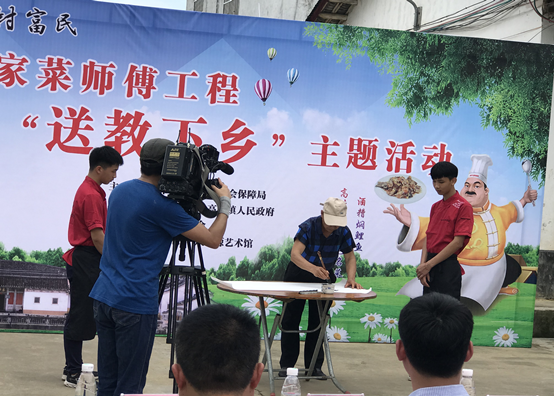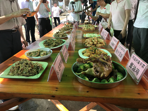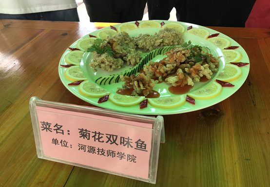 隨后,在河源好人成木源先生的題字后,各村廚藝高手開始制作特色菜、拿手菜。同時,我院謝志海老師示范制作客家特色創(chuàng)新菜——菊花雙味魚。