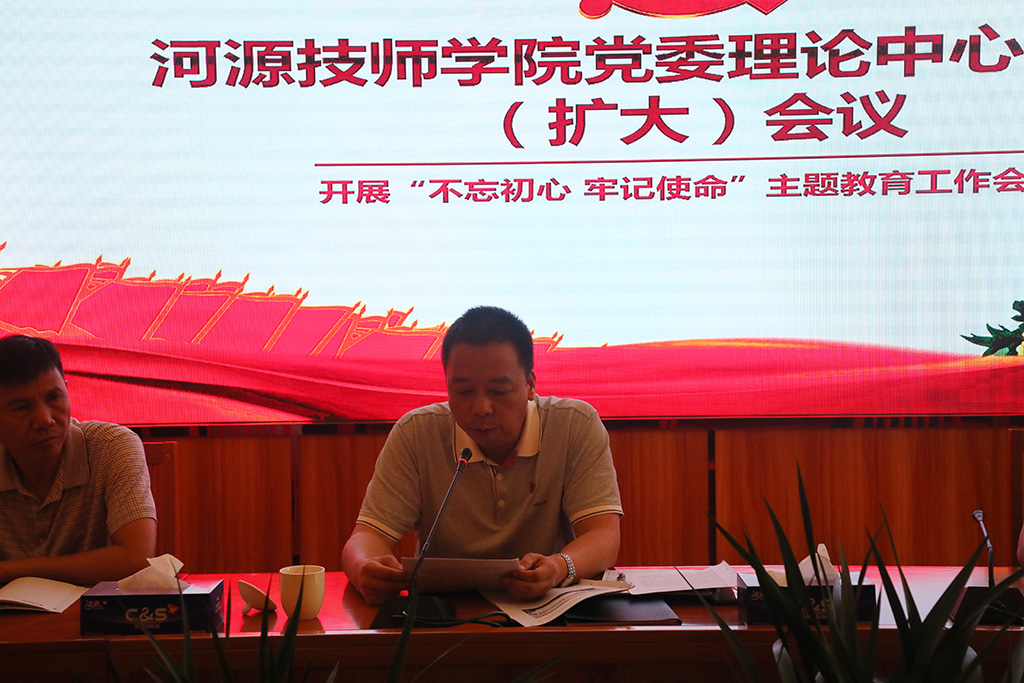 2019年5月29日上午,我院在一號(hào)樓大會(huì)議室召開(kāi)理論中心組學(xué)習(xí)(擴(kuò)大)會(huì)議,傳達(dá)學(xué)習(xí)“不忘初心 牢記使命”主題教育工作會(huì)議精神。學(xué)院黨委會(huì)委員、各黨支部書記、中層管理干部和各教學(xué)系正、副主任參加了會(huì)議。