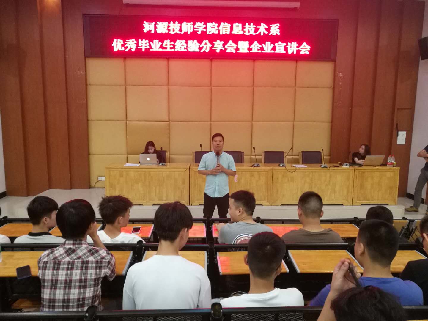 為幫助學生樹立正確的擇業(yè)觀,2019年6月11日晚,信息技術(shù)系在培訓樓講學廳召開了優(yōu)秀畢業(yè)生經(jīng)驗分享會。學院2013級計算機網(wǎng)絡(luò)應(yīng)用專業(yè)優(yōu)秀畢業(yè)生杜歷鵬,應(yīng)邀前來為信息技術(shù)系200余名即將參加頂崗實習的學生進行經(jīng)驗分享。