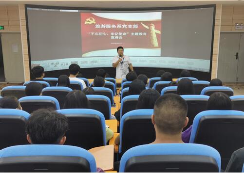 按學院黨委的統(tǒng)一部署,旅游服務系黨支部于2019年10月9日晚在培訓樓3D導游實訓室開展“不忘初心、牢記使命”主題教育宣講會。旅游服務系黨支部書記為旅游服務系支部黨員與團學會干部共100余人舉行了一場別開生面的專題黨課。