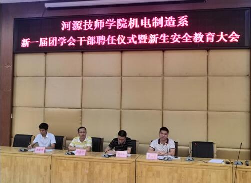 2019年10月16日下午,機(jī)電制造系在學(xué)院培訓(xùn)樓講學(xué)廳舉行新一屆團(tuán)學(xué)干部聘任儀式暨新生安全教育大會(huì)。機(jī)電制造系全體團(tuán)學(xué)干部、2019級(jí)新生及班主任參加了此次大會(huì)。