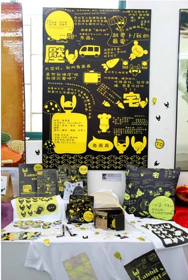 2010級(jí)電腦美工高級(jí)班劉云龍同學(xué)一直很喜歡卡通,在這次畢業(yè)設(shè)計(jì)展中,他設(shè)計(jì)了一組名為《兔乖乖》的作品,以一個(gè)可愛的乖兔子形象,生動(dòng)、幽默地演繹了網(wǎng)絡(luò)爆笑語錄,讓人看了忍俊不禁。黑色跟黃色的搭配形成強(qiáng)烈的對比,視覺效果非常好。該設(shè)計(jì)包括枕頭、筆記本、衣服、書簽等一系列產(chǎn)品,旨在為消費(fèi)者打造一個(gè)輕松幽默的生活空間。據(jù)了解,3家企業(yè)同時(shí)看上了這份作品,爭相邀請劉云龍同學(xué)到自己的公司工作。