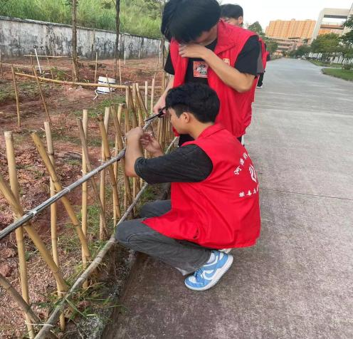 在活動中,室內(nèi)設(shè)計專業(yè)志愿者制定維護計劃,團學(xué)成員分工合作,共同完成任務(wù)。一共完成了學(xué)院7大系部近500米種植園地護欄修補。