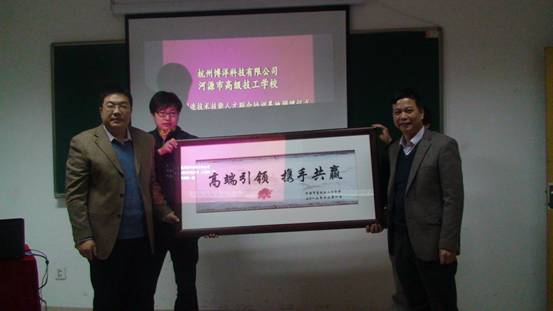 黎海波校長親切慰問了在杭州學習的“逆向班”學員們,他鼓勵學員們要珍惜機會,努力學習,爭取早日成材。黎海波校長說,通過共建先進制造技能人才培訓基地的方式,我校與杭州博洋科技有限公司共同確定培養(yǎng)目標、制定教學計劃、調(diào)整課程設(shè)置、加強頂崗實習,全面實現(xiàn)校企零距離對接,希望在雙方共同努力下結(jié)出豐碩的成果。為答謝杭州博洋科技有限公司對“逆向班”學員們在學習、生活上的幫助,黎海波校長還代表學校為公司贈送“高端引領(lǐng),攜手共贏”牌匾。