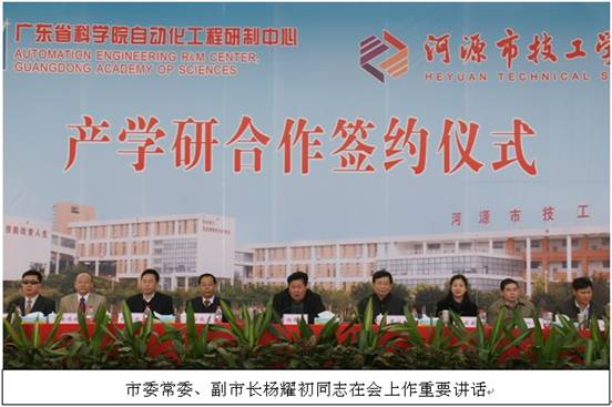 楊耀初副市長(zhǎng)表示,此次省科院自動(dòng)化中心與市技工學(xué)校的產(chǎn)學(xué)研合作,是我市實(shí)施“科教興市”戰(zhàn)略思路的一項(xiàng)舉措。合作協(xié)議的實(shí)施,將大大提高市技工學(xué)校電氣自動(dòng)化和機(jī)電一體化專業(yè)的人才培養(yǎng)質(zhì)量,提高學(xué)校的品位,進(jìn)一步為河源經(jīng)濟(jì)社會(huì)特別是河源工業(yè)生產(chǎn)自動(dòng)化又好又快發(fā)展提供人才保障,有效緩解社會(huì)用工荒、招工難問題。