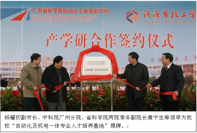 市委常委、副市長(zhǎng)楊耀初出席了簽約儀式,并為我校成為廣東省科學(xué)院自動(dòng)化工程研制中心(廣東省自動(dòng)化與信息技術(shù)轉(zhuǎn)移中心)“自動(dòng)化及機(jī)電一體專業(yè)人才培養(yǎng)基地”揭牌。
