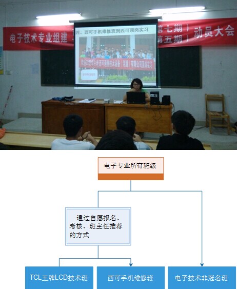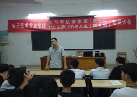 6月11日,我院電氣應(yīng)用系電子技術(shù)教研組在8號(hào)樓104階梯教室召開“西可手機(jī)維修班(第七期),TCL王牌LCD技術(shù)班(第五期)”動(dòng)員大會(huì)。參加此次動(dòng)員大會(huì)的有學(xué)院教務(wù)科鄒坤新副科長(zhǎng)、電氣應(yīng)用系鐘偉東副主任、電子技術(shù)教研組組長(zhǎng)呂秋珍老師,冠名班優(yōu)秀畢業(yè)生代表劉武軍、劉俏良、曾海鋒,電氣應(yīng)用系各班班主任以及2014級(jí)電子技術(shù)專業(yè)的全體學(xué)生。