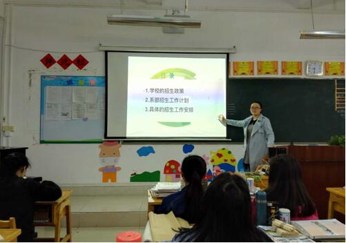2017年3月29日下午,旅游服務(wù)系在2202教室召開“旅游服務(wù)系班主任招生工作動員會”。旅游服務(wù)系主任謝龍桂老師、副主任陳偉寧老師、羅丹老師,以及旅游服務(wù)系全體班主任參加了此次會議。會上,陳偉寧老師就學(xué)校招生政策、以及學(xué)院招生工作任務(wù)、考核細(xì)節(jié)進(jìn)行詳細(xì)解說,并公布了我系各專業(yè)預(yù)招生班級及人數(shù)。隨后,他就接下來招生工作的任務(wù)安排進(jìn)行分配,并再次強(qiáng)調(diào)此項(xiàng)工作的重要性。